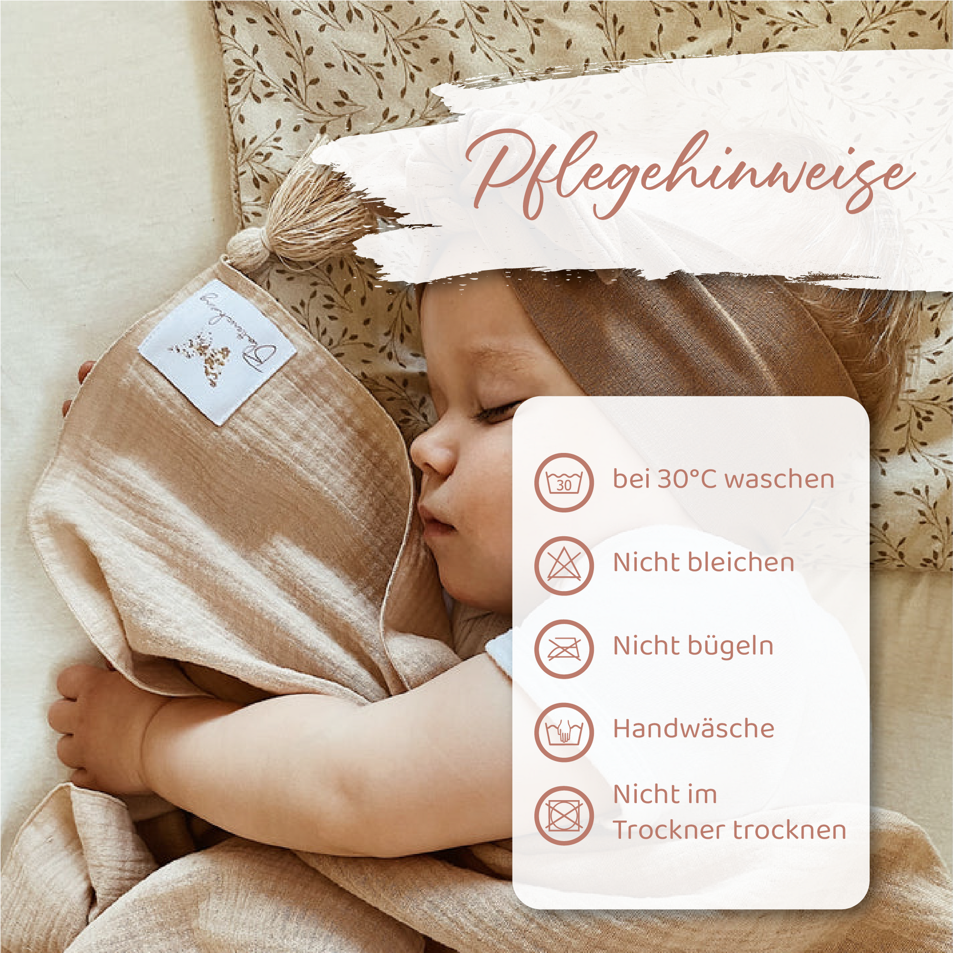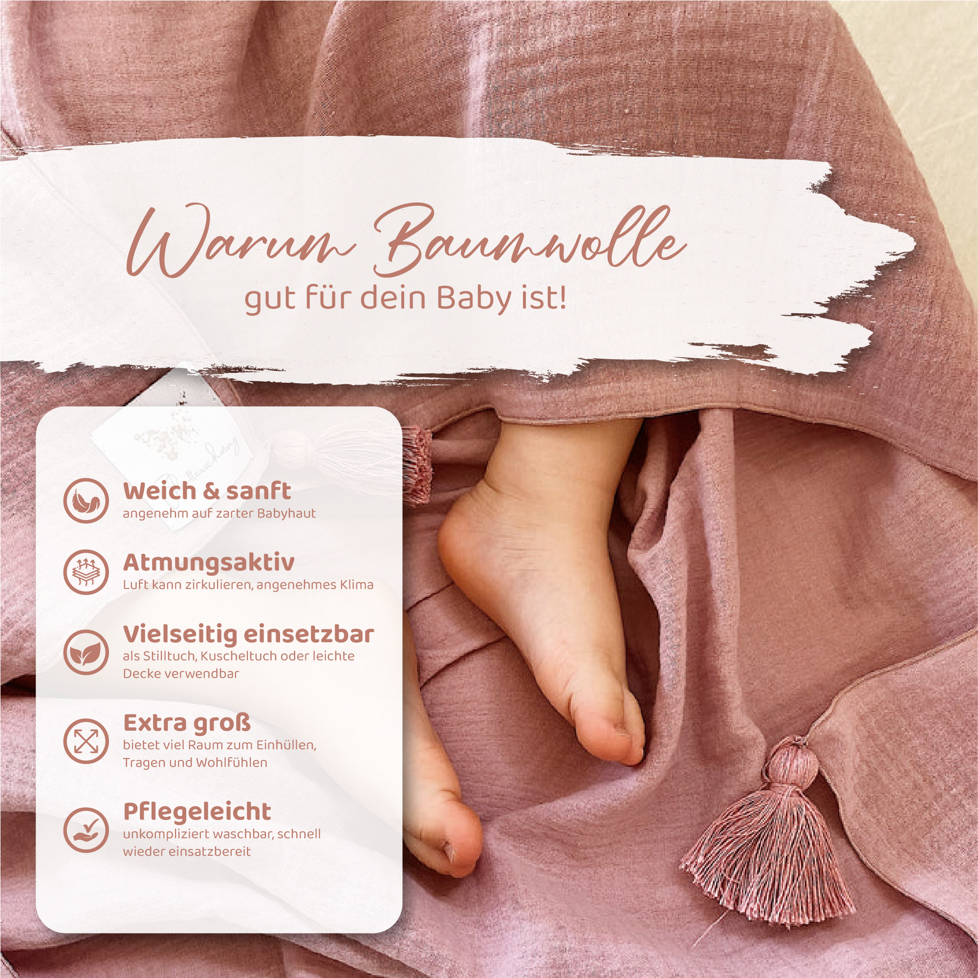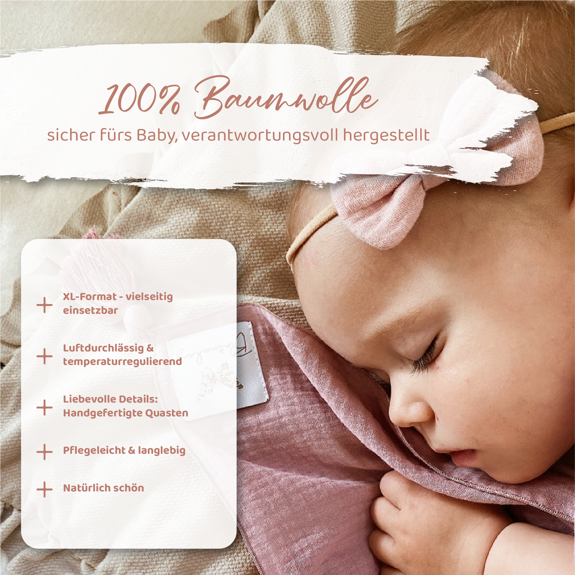 Leicht wie eine Brise, weich wie eine Umarmung – das XL Musselintuch mit süßen Quasten ist dein treuer Begleiter für jeden Tag mit deinem Baby.